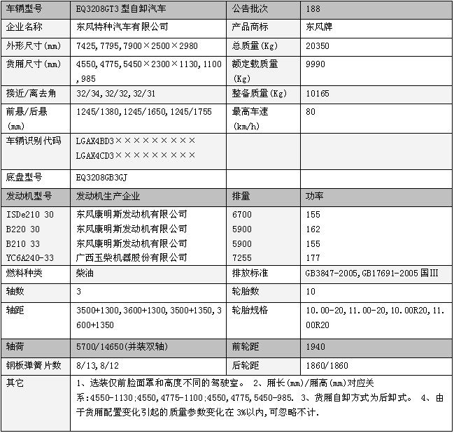 底盤:EQ3208GB3GJ,發(fā)動機:ISDe210 30 B220 30 B190 33 B210 33